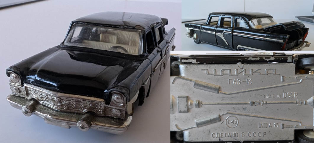 Nous commençons par une ZIL, voiture d’apparat russe, une chose quand même assez exceptionnelle car de fabrication « CCCP » donc durant l’ex URSS… Ne me demandez pas de traduire le cyrillique. Echelle 1/43e qui indique que la berline originale doit être énorme. J’ai fini malgré tout par l’identifier : Voiture russe URSS Chaika Gaz 13 СУВЕНИР ЧАИКА ГАЗ-13 1/43. Elle se vend plus de 100 euros avec sa boîte, ce n’est pas le cas de la mienne que j’estime dans les 50 euros. Fabrication 1980 mais vu le look il s’agit d’un modèle plus ancien qui est représenté.