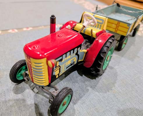 Tracteur KDN Valnikem, Kovodruzstvo Nachod Tchéquie, tôle emboutie avec remorque, prix moyen dans cet état 45 euros (80 avec boîte), années 80. Trouvé sur un vide-greniers pour une trentaine d’euros. J’ai trouvé ce jouet sympa même s’il est relativement récent par rapport à mes recherches habituelles. La tchéquie produit pas mal je jouets à clé en métal jusqu’à nos jours. Propulsion mécanique avec clé. Je « piste » un autre tracteur mais des années soixante Renault. J’avais le même durant les sixties et il n’a pas survécu. Il se vend environ 200 euros en bon état. Il le mérite car il est très fidèle au niveau reproduction pour l’époque bien plus que le jouet tchèque présenté. Tracteur Agricole Renault. 20 cm. Référence CIJ , N°8/51, (1952).