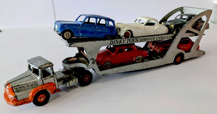 Porte-voitures Dinky super Toys Unic Izoard porte voitures Boileau. Fabrication entre 1955 et 1970. Je viens de me rendre compte que je n’avais pas mis sur le site mon premier exemplaire de ce jouet acheté donc avant celui-ci. Très bon état avec boîte, de même qu’un autre Dinky le camion pompier Delahaye avec sa grande échelle dépliable et également une belle boîte. Je le ferai dans la prochaine page sur cette thématique. Ce porte-voiture Dinky donc identique à mon premier je l’ai acheté pour 30 euros ce qui est un prix intéressant vu qu’il est tout de même en bon état, certes sans boîte mais complet, tous les mécanismes opérationnels, juste la peinture un peu plus « passée » que mon autre exemplaire. Alors je me suis dit « c’est pas mal ces porte-voitures en plus ils peuvent servir de présentoir pour d’autres autos Dinky… »
