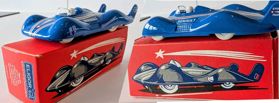 Reproduction Eligor Renault « Etoile filante » à turbine 1/43e 1956, réédition neuve dans les 20 euros grand maxi. Très belle qualité de reproduction, je l’ai payée dix euros et je trouvais sympa ce look rétro de ce qui correspondait au summum technologique des années cinquante ayant atteint… 309 km/h…
