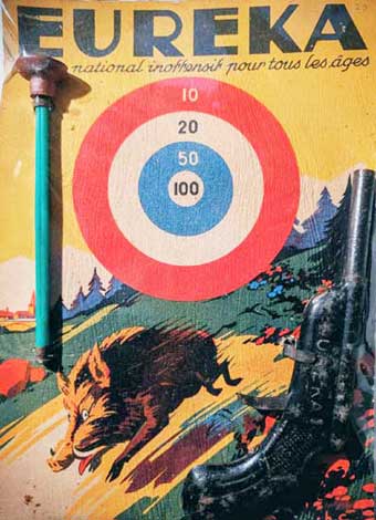En très bon état je pense que cela monte à 40 euros. Il faut savoir que la marque Euréka a produit depuis 1900 énormément de jouets métalliques… Autos à pédales et nombreux pistolet et fusils à flèches mais aussi tirant des billes, durant la première guerre mondiale, mitrailleuses (!) voire un tir à fléchettes qui se nommait « la tranchée à boches » où des cibles avec têtes de soldats allemands étaient à « décaniller ». Il y eu aussi lors de la deuxième guerre mondiale des tirs à la mitrailleuse contra avions, tirs aux pigeons…