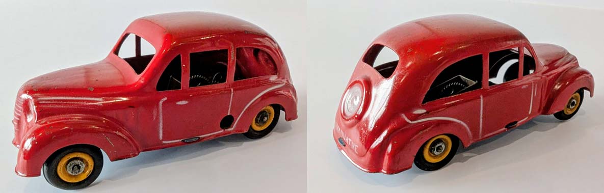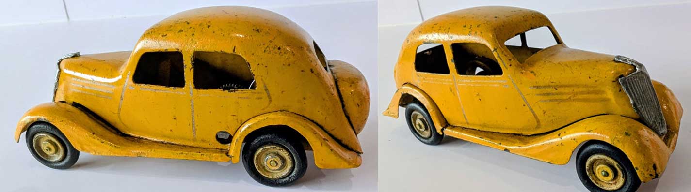 Renault Celta 4, manufacture CIJ, année… 1938. Ce modèle en tôle emboutie n’est vraiment pas fréquent dans les conventions de collectionneurs. J’ai eu la chance de pouvoir l’acheter pas trop cher en fin de salon, le vendeur avait sans doute besoin de liquidités et j’étais son dernier espoir. J’aime bien ce genre de jouets, j’écrirais même que ce sont mes préférés, même s’ils sont un peu encombrants car plus gros que le 1/43e des Dinky et autres jouets en zamac.
