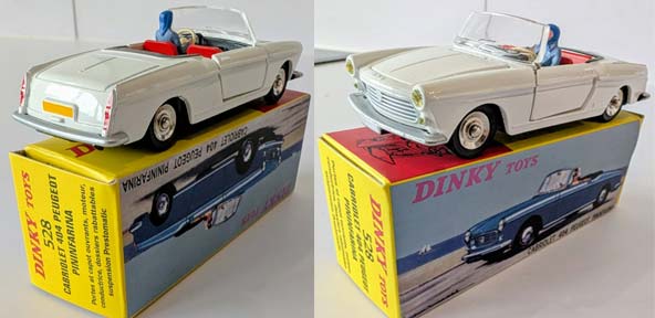 Cette Peugeot 404 cabriolet Dinky Toys mais réédition Atlas est donc quasiment neuve bien qu’Atlas ne fabrique plus de copies de Dinky Toys. Leurs productions finalement commencent donc à prendre un peu de valeur vu l’arrêt de production et le fait que certains modèles vu le mode d’achat particulier sont plus rares. Il y avait des modèles de promotion qui étaient proposés assez peu cher. On les trouvait chez les marchands de journaux vu l’utilisation de la diffusion presse de type NMPP. Si on voulait d’autres modèles, les plus nombreux, il fallait souscrire à une sorte d’abonnement, etc. et ils étaient plus chers donc beaucoup moins répandus que ceux qui étaient en quelques sorte « en tête de gondole »pour attirer le chaland… Bref cette auto qu’il fallait commander à ma connaissance peut se trouver pour une vingtaine d’euros pour l’instant bien entendu avec sa boîte, donc si elle est plus cher… c’est trop pour l’instant malgré la finalement assez grande qualité de fabrication, même chinoise comme on peut l’entrevoir sur la photo. Je me répète mais j’aime bien les roadsters et ou cabriolets jouets en plus avec personnage…