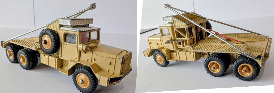 Sur un vide-greniers, je suis « tombé » devant un marchand très sympa mais qui ne semblait pas rouler sur l’or… Il avait plein de petites autos mais de modèles trop « récents » pour moi. Et miracle je découvert ce camion Berliet GBO Dinky Super Toys ref 888 pétrolier saharien 1960 mais avec un plateau vide donc sans la grue que l’on aperçoit rabaissée en position « Transport ». La mention « Dinky Super Toys » était utilisée pour les camions ou engins d’un assez gros gabarit (tout en restant à l’échelle 1/43e).
